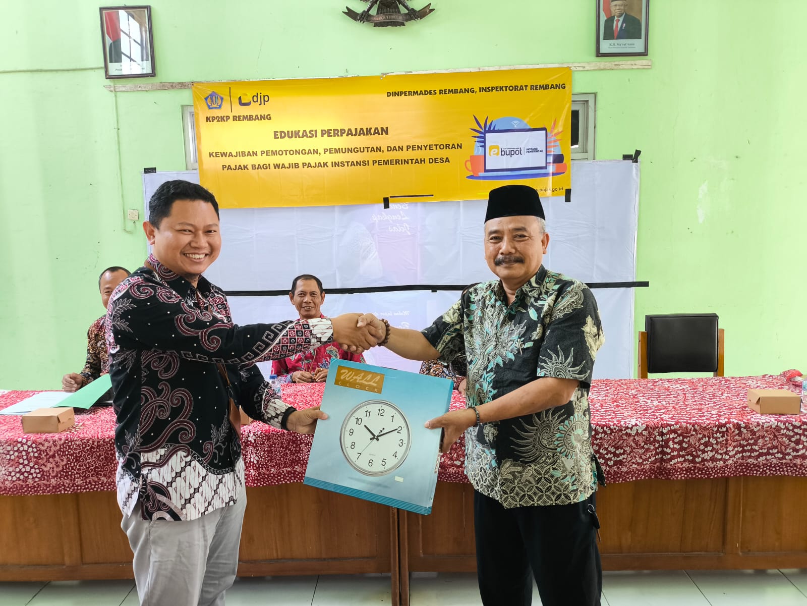 Kantor Pelayanan, Penyuluhan dan Konsultasi (KP2KP) Rembang bekerja sama dengan Kantor Pelayanan Pajak (KPP) Pratama Pati dan Dinas Pemberdayaan Masyarakat dan Desa (DINPERMADES) Kabupaten Rembang menyelenggarakan Sosialisasi Perpajakan terkait kewajiban perpajakan Instansi Pemerintah kepada Wajib Pajak Instansi Pemerintah Desa pada Selasa dan Kamis, 6 dan 8 Agustus 2024 bertempat di Aula DINPERMADES Rembang.