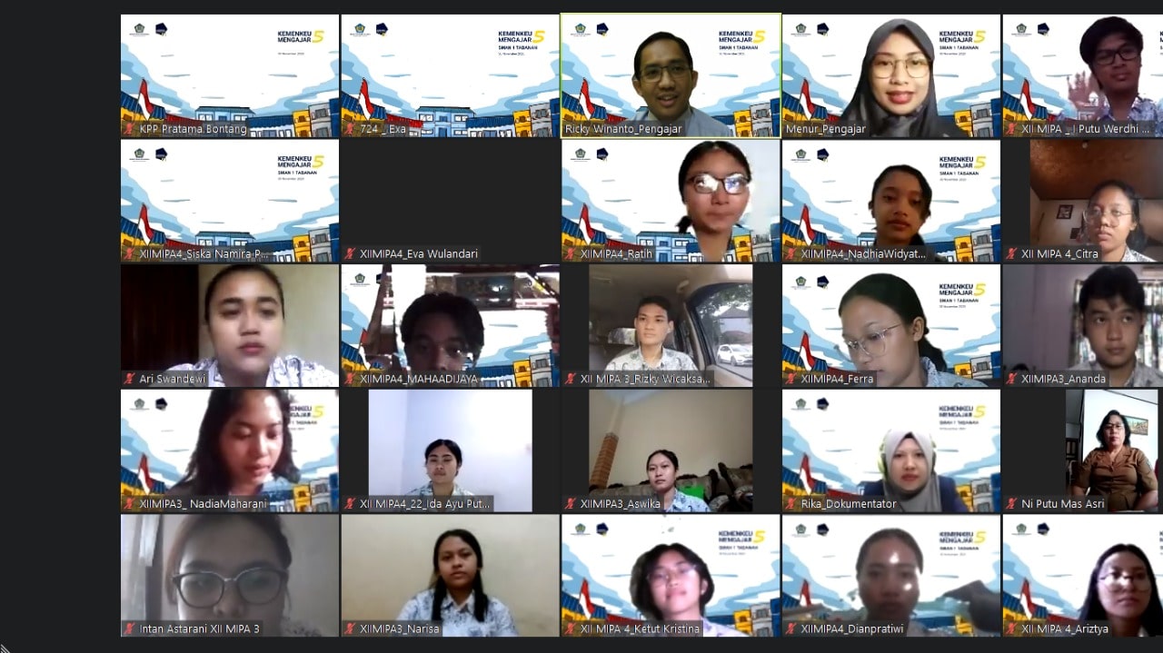 Ada yang berbeda dengan penyelenggaraan Kemenkeu mengajar tahun ini. Dibanding tahun tahun sebelumnya yang dilaksanakan langsung ke sekolah sekolah, tahun ini dikarenakan adanya pandemi covid-19 maka kegiatan Kemenkeu Mengajar 5 (KM5) ini diadakan secara daring melalui aplikasi zoom meeting. KP2KP Sangatta berkesempatan untuk mengajar siswa siswi SMAN 1 Tabanan Bali sebanyak 52 pelajar.