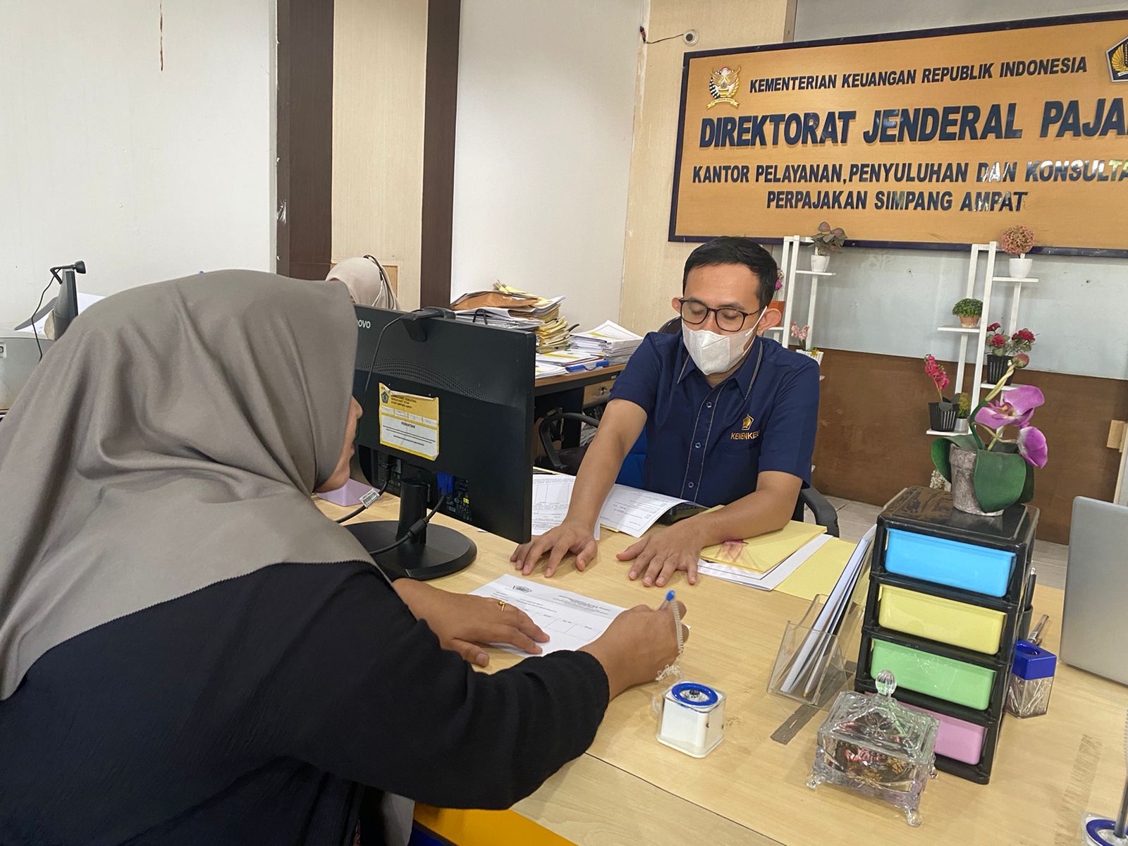 Seorang pengurus perusahaan mendatangi Kantor Pelayanan, Penyuluhan, dan Konsultasi Perpajakan (KP2KP) Simpang Ampat untuk mendaftarkan NPWP Badan pada Rabu (20/8). Petugas KP2KP Simpang Ampat siap memberikan asistensi dan edukasi kepada Wajib Pajak yang melakukan pendaftaran NPWP secara daring.