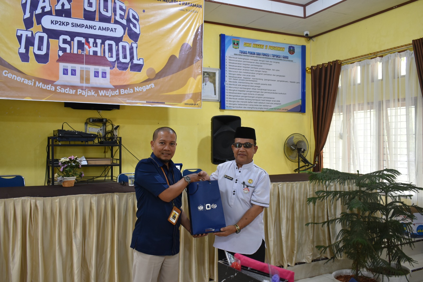Kantor Penyuluhan, Pelayanan, dan Konsultasi Perpajakan (KP2KP) Simpang Ampat mengadakan kegiatan Tax Goes To School (TGTS) di SMA Negeri 2 Pasaman, Pasaman Barat, Sumatera Barat (Rabu, 31/7). Kegiatan ini mengusung tema "Sadar Pajak Bukti Peduli Pada Negeri."