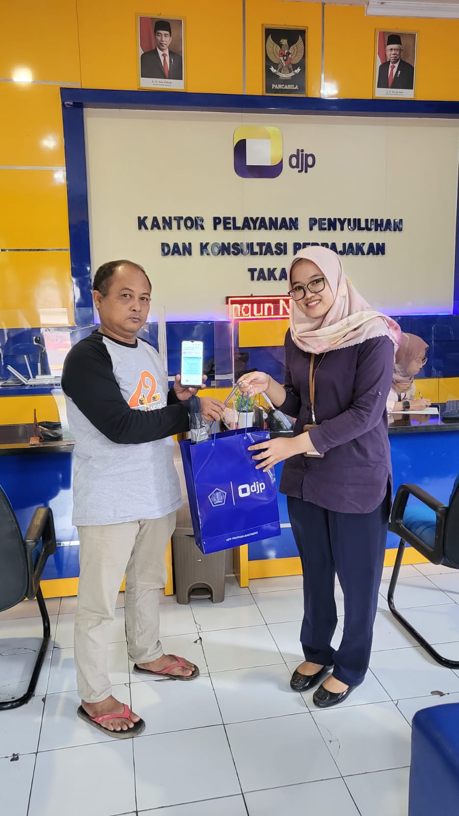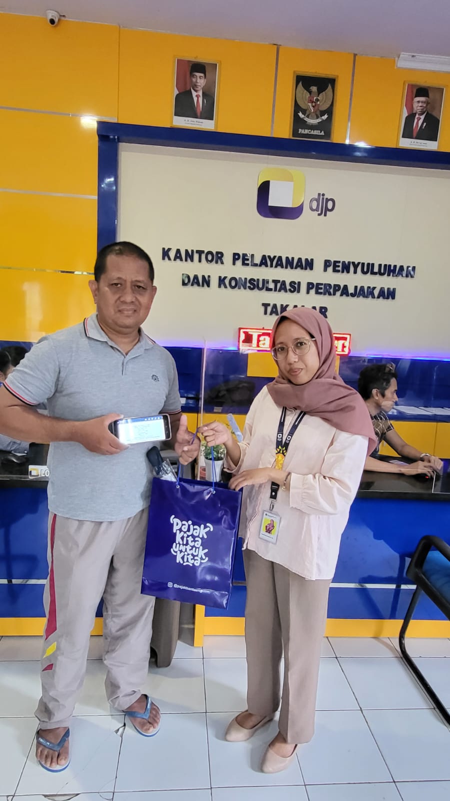 KP2KP Takalar memberikan apresiasi berupa pemberian souvenir sebagai bentuk terima kasih kepada wajib pajak atas inisiatif dan antusias dalam melaporkan SPT Tahunan di awal tahun sehingga bisa menjadi contoh bagi wajib pajak lain. Pelaporan SPT Tahunan Orang Pribadi Tahun Pajak 2023 sudah dapat dilaporkan mulai 1 Januari 2024 sampai dengan 31 Maret 2023 dimana tertuang dalam UU KUP Nomor 6 Tahun 1983 sebagaimana telah diubah terakhir dengan UU HPP Nomor 7 Tahun 2021 untuk Surat Pemberitahuan Tahunan Pajak Penghasilan Wajib Pajak Orang Pribadi, paling lama 3 (tiga) bulan setelah akhir tahun pajak.
