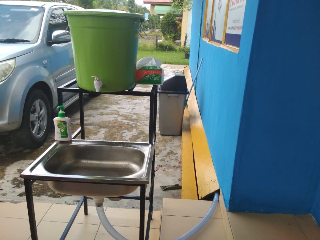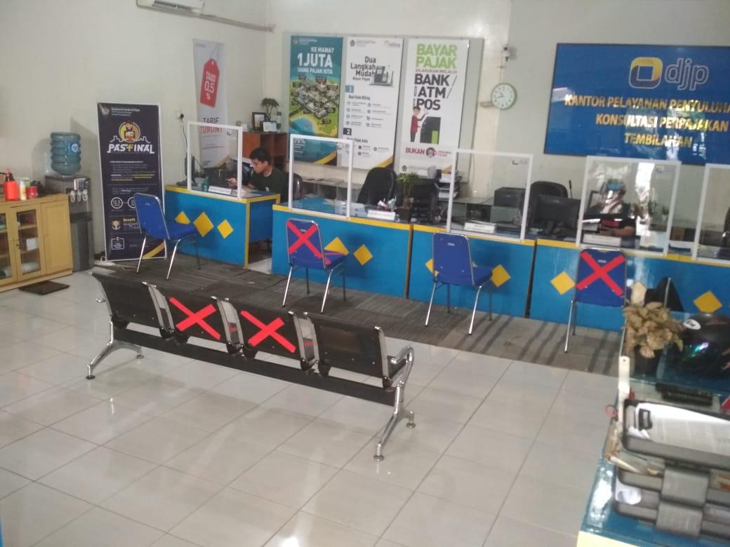 Pegawai KP2KP Tembilahan bersinergi dalam mempersiapkan beberapa hal seperti menambahkan sekat pembatas di meja tempat pelayanan terpadu, memberikan jarak antara wajib pajak yang menunggu antrean, menyediakan tempat cuci tangan, dan penyemprotan cairan disinfektan.