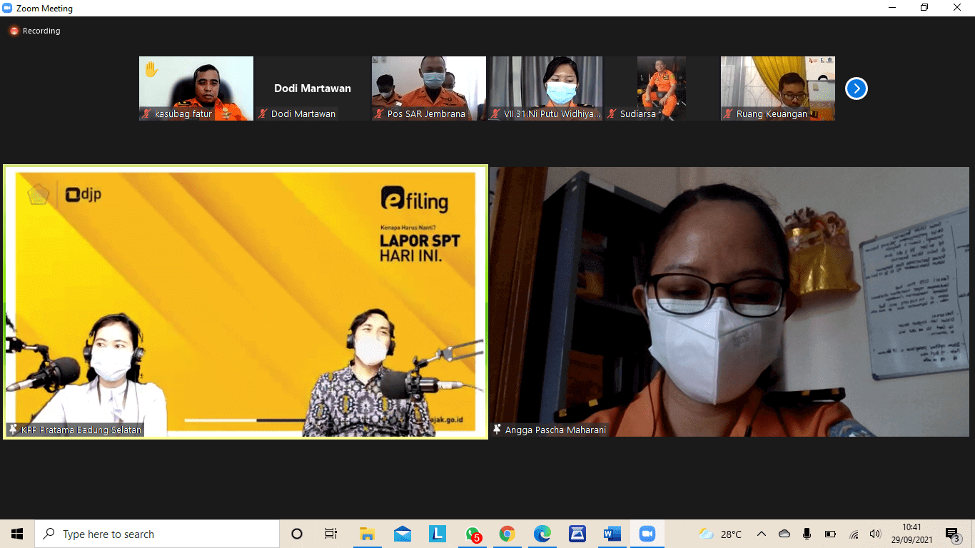 Kegiatan tersebut dilaksanakan secara daring melalui Zoom Cloud Meeting. Adapun peserta kelas pajak online tersebut dihadiri oleh 54 Karyawan SAR Denpasar dengan narasumber fungsional penyuluh pajak KPP Pratama Badung Selatan yaitu Lalu Mohammad Ramdi dan Sherley Diana Thandung.