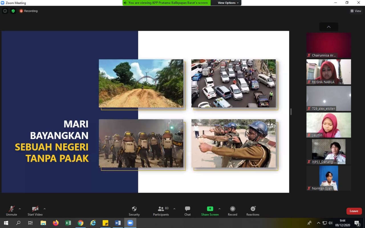 Kantor Pelayanan Pajak (KPP) Pratama Balikpapan Barat menyelenggarakan kegiatan Tax Goes To School (TGTS) dengan tema "Gotong Royong Membangun Negeri" (Selasa, 8/12). Acara yang diadakan secara daring di Kota Balikpapan ini diikuti oleh 81 peserta dari SMAN 1 Balikpapan.