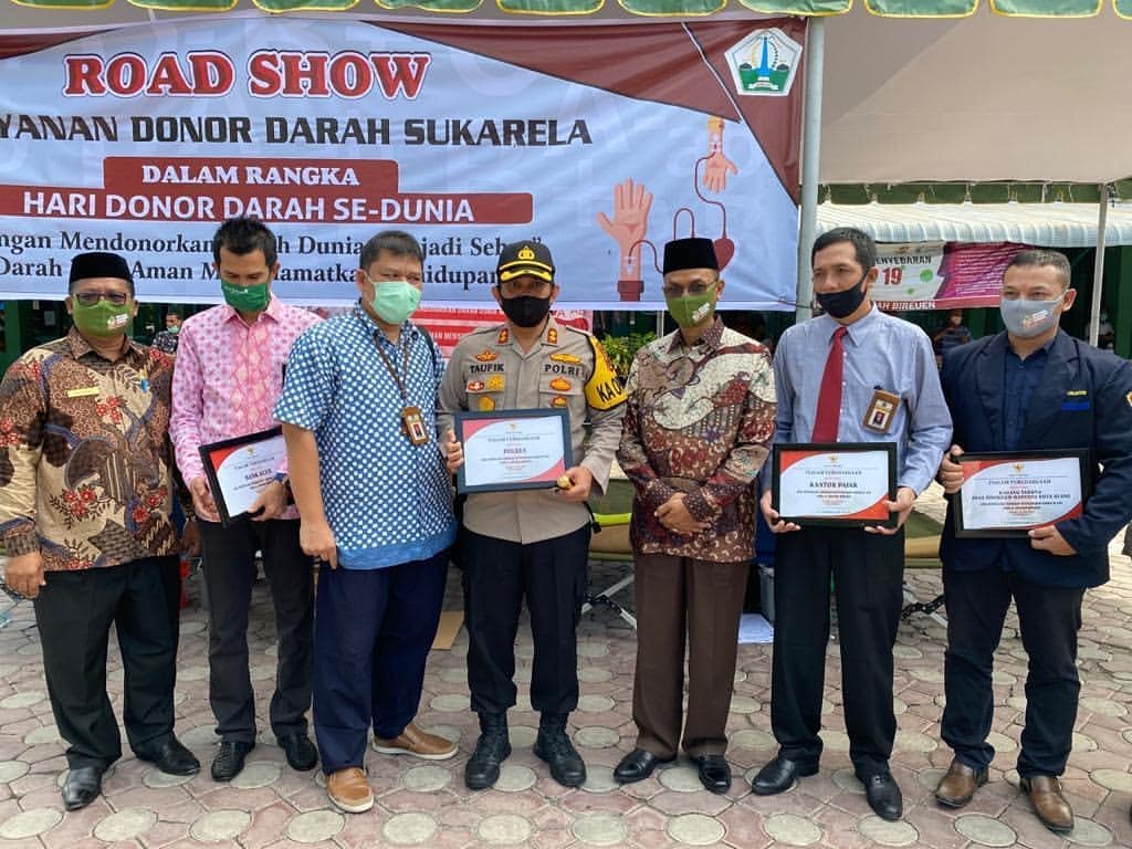 KPP Pratama Bireuen menerima penghargaan dari Pemerintah Kabupaten Bireuen dan RSUD dr. Fauziah Bireuen dalam peringatan Hari Donor Darah se-Dunia di Lapangan RSUD dr. Fauziah Bireuen, Aceh (Kamis, 25/6).