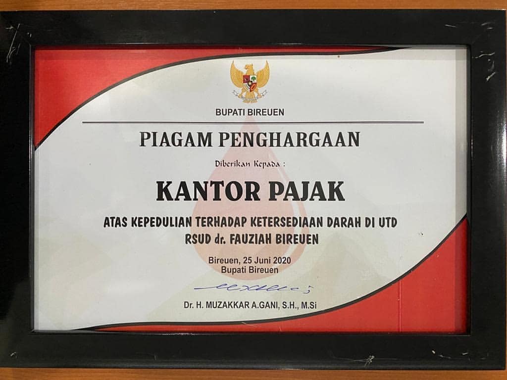 Penghargaan diberikan atas kontribusi dan kepedulian KPP Pratama Bireuen terhadap ketersediaan darah di UTD RSUD dr. Fauziah Biruen. Penghargaan langsung diberikan oleh Bupati Bireuen Dr. Muzakkar A. Gani, S.H., M.Si.