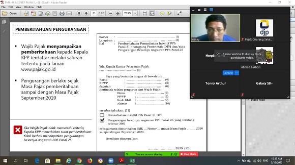 KPP Pratama Cikarang Selatan mengadakan kelas pajak tentang insentif perpajakan selama masa pandemi Covid-19, yang diselenggarakan secara daring melalui aplikasi Zoom (Senin, 18/5).