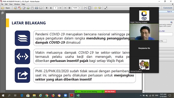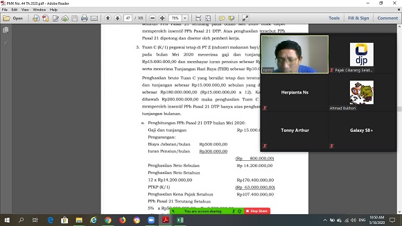 Ronny Catur Kushartono selaku Account Representative KPP Pratama Cikarang Selatan bertugas menjadi narasumber pada kelas pajak daring kali ini dengan membahas Peraturan Menteri Keuangan Nomor 44 Tahun 2020.
