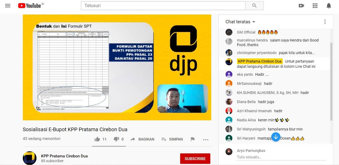 KPP Pratama Cirebon Dua menyelenggarakan Sosialisasi Perpajakan “Implementasi Nasional e-Bupot PPh 23/26 untuk seluruh PKP” dengan media Live Streaming Youtube yang dilangsungkan di Cirebon (Rabu, 5/8).