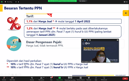 Kantor Pelayanan Pajak (KPP) Pratama Cirebon Dua mengadakan sosialisasi Undang-Undang Harmonisasi Peraturan Perpajakan (UU HPP) secara daring melalui media aplikasi Zoom Meeting di Cirebon, Jawa Barat (Selasa, 31/5). Sosialisasi UU HPP ini dimulai pukul 09.00 WIB. Kegiatan ini diikuti oleh Wajib Pajak Badan PKP dan Instansi Pemerintah (Pusat, Daerah dan Desa) di Wilayah Kabupaten Cirebon.
