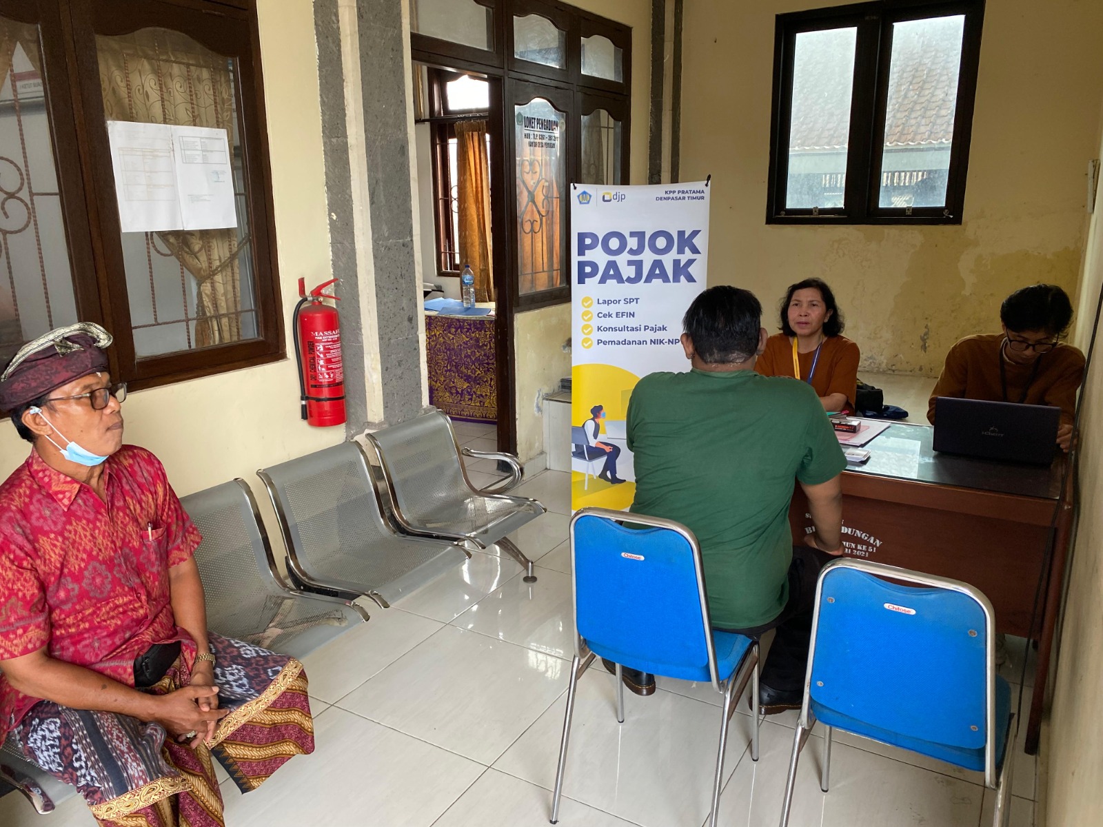 Kantor Pelayanan Pajak (KPP) Pratama Denpasar Timur menyelenggarakan kegiatan pojok pajak di Kantor Desa Pemogan, Kota Denpasar (Kamis, 31/10). Kegiatan ini bertujuan untuk memberikan layanan konsultasi langsung kepada para wajib pajak di wilayah tersebut dan untuk mempermudah wajib pajak yang membutuhkan informasi serta bimbingan terkait kewajiban perpajakan.