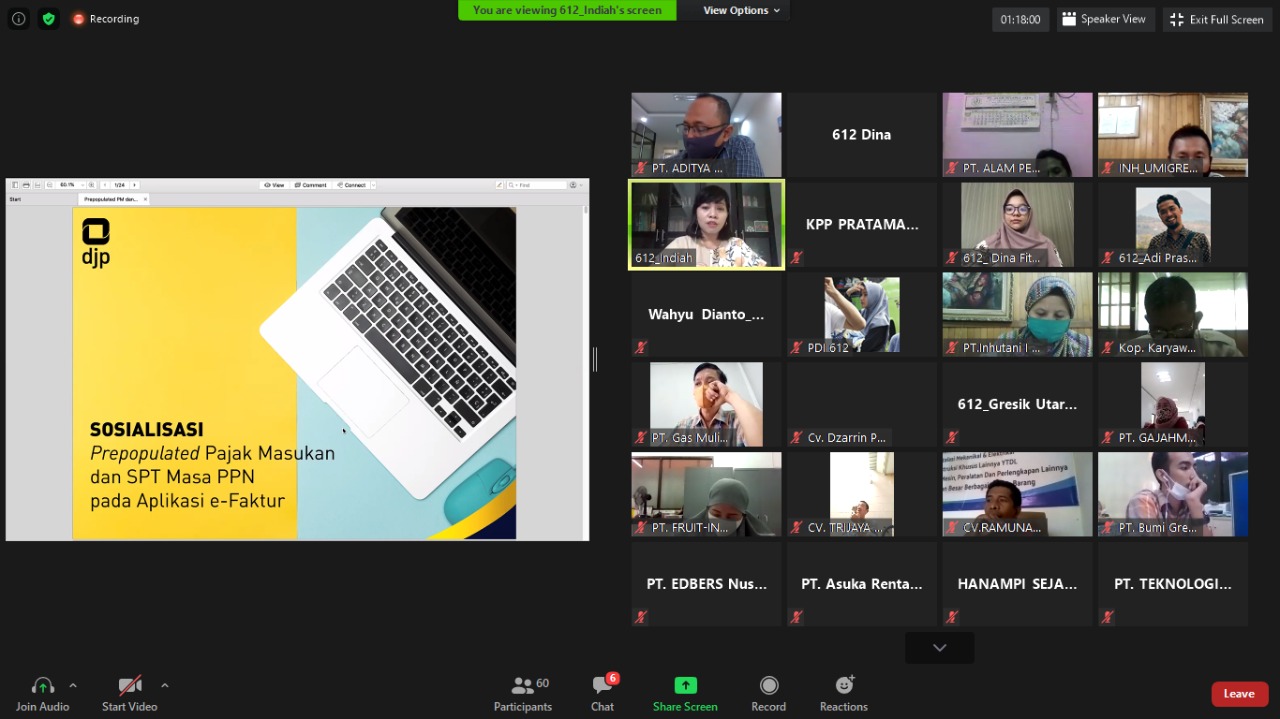 Kantor Pelayanan Pajak (KPP) Pratama Gresik Utara menyelenggarakan kelas pajak dengan tema Sosialisasi Implementasi Prepopulated Pajak Masukan dan SPT Masa PPN pada Aplikasi e-Faktur di Gresik (Kamis, 24/9). Sebanyak 57 peserta yang merupakan Pengusaha Kena Pajak (PKP) mengikuti kelas pajak yang dilaksanakan secara daring tersebut.