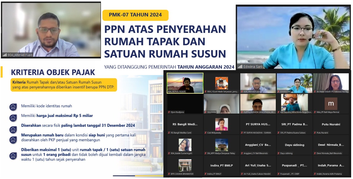 Fungsional Penyuluh Pajak Kantor Pelayanan Pajak (KPP) Madya Denpasar melakukan edukasi kepada wajib pajak terdaftar tentang Peraturan Menteri Keuangan (PMK) Nomor 7 Tahun 2024 tentang Pajak Pertambahan Nilai Atas Penyerahan Rumah Tapak Dan Satuan Rumah Susun Yang Ditanggung Pemerintah Tahun Anggaran 2024 secara daring melalui zoom meeting (Kamis, 28/3).
