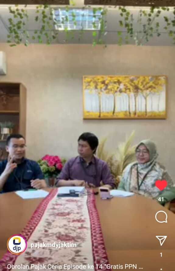 Kantor Pelayanan Pajak (KPP) Madya Jakarta Timur (Jaktim) menghadirkan Obrolan Pajak Ceria Episode 14, Kota Jakarta Timur. Melalui Instagram Live dari akun @pajakmdyjaktim, Fungsional Penyuluh Pajak KPP Madya Jaktim membahas tema "Gratis Pajak Pertambahan Nilai (PPN) Beli Rumah Rp2 Miliar" di Ruang Integrity KPP Madya Jaktim (Kamis, 14/3).