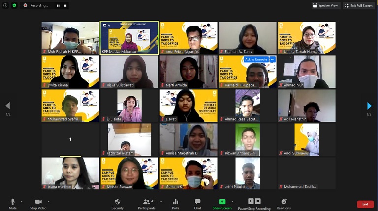 Tim Penyuluh Kantor Pelayanan Pajak (KPP) Madya Makassar memberikan edukasi pajak secara daring pada kegiatan Campus Goes to Tax Office bersama 48 Mahasiswa Politeknik Negeri Ujung Pandang (PNUP) di Kota Makassar (Jumat, 13/11). Kegiatan yang dilaksanakan melalui media zoom meeting ini berlangsung selama dua jam sejak pukul 14.00 WITA.