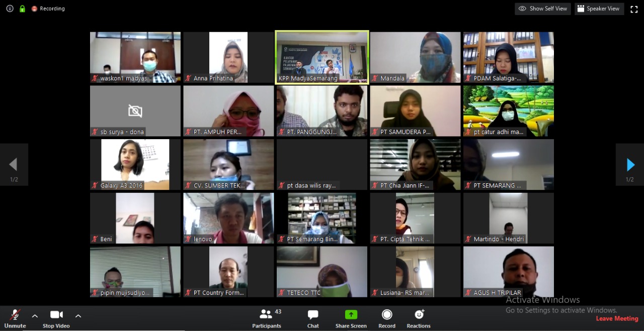 KPP Madya Semarang kembali menggelar kelas pajak yang dilakukan secara daring (online) melalui aplikasi telekonferensi Zoom Meeting (Kamis, 23/4). Mengusung tajuk Sosialisasi Insentif Pajak PMK Nomor 23 Tahun 2020, narasumber mengajak peserta untuk memanfaatkan insentif pajak yang diberikan pemerintah dalam rangka penanggulangan dampak virus Covid-19.