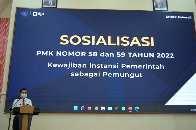 Kantor Pelayanan Pajak (KPP) Pratama Majene menyelenggarakan acara Sosialisasi Peraturan Menteri Keuangan (PMK) Nomor 59 di Ruang Pola Kantor Bupati Polewali Mandar, Kabupaten Polewali Mandar (Senin, 23/5). Sebanyak 120 orang hadir mewakili instansi pemerintah di lingkungan Pemerintah Daerah Kabupaten Polewali Mandar.