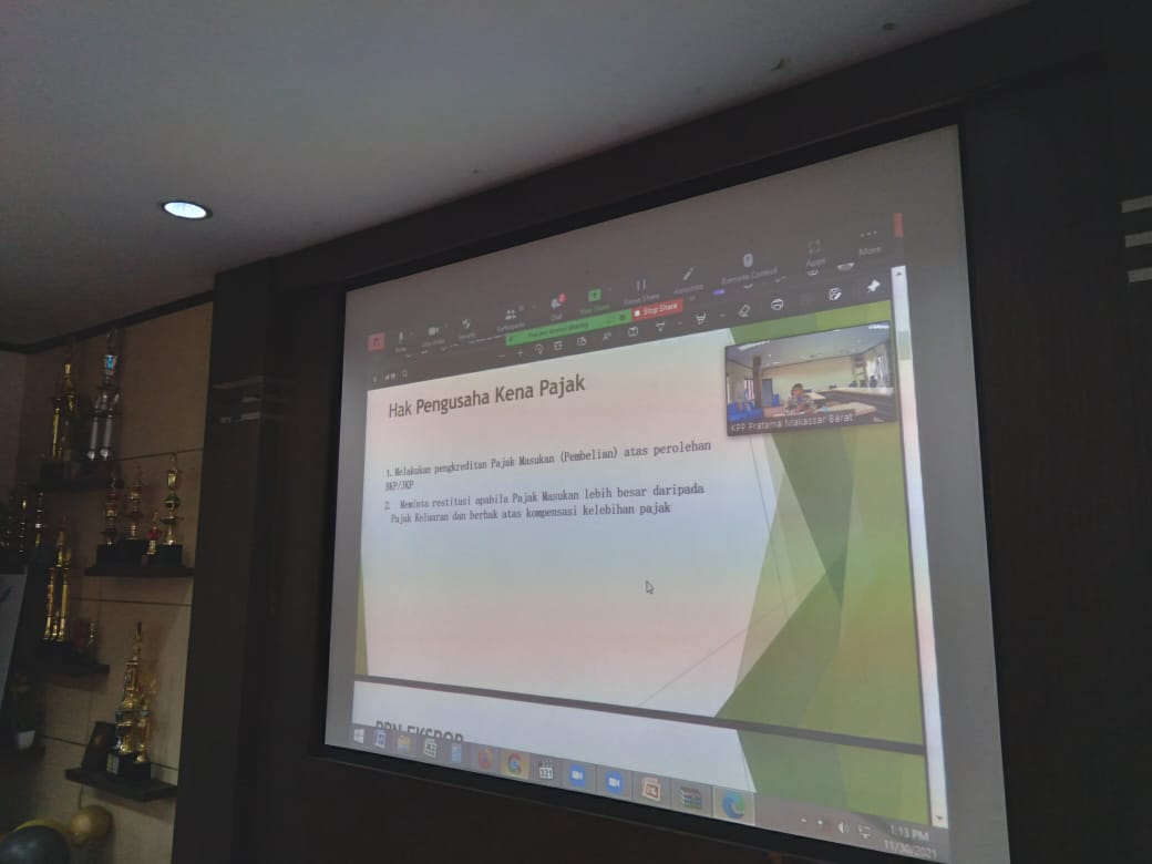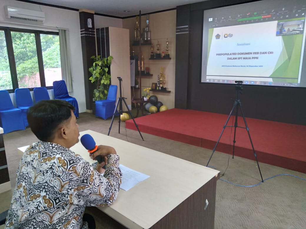 Kantor Pelayanan Pajak (KPP) Pratama Makassar Barat menyelenggarakan Sosialisasi terkait Implementasi Prepopulated Dokumen PEB dan Dokumen CK-1 dalam Laporan SPT PPN melalui Kelas Pajak Online yang dilakukan secara daring dari ruang aula KPP Pratama Makassar Barat, Kota Makassar (Selasa, 30/11). Kegiatan ini diikuti oleh 10 Pengusaha Kena Pajak (PKP) yang merupakan wajib pajak terdaftar KPP Pratama Makassar Barat.