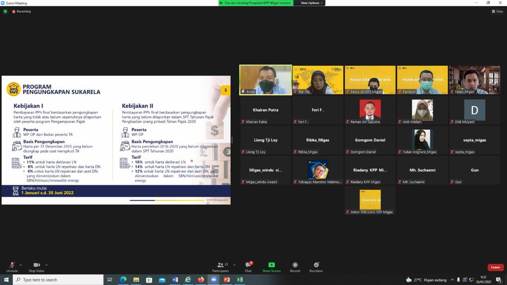 Kantor Pelayanan Pajak Minyak dan Gas Bumi (KPP Migas) mengadakan Kelas Pajak Online dengan tema Edukasi Perpajakan Program Pengungkapan Sukarela (PPS) melalui Zoom Cloud Meeting di Ruang Edukasi KPP Migas, Jakarta (Rabu, 26/01).