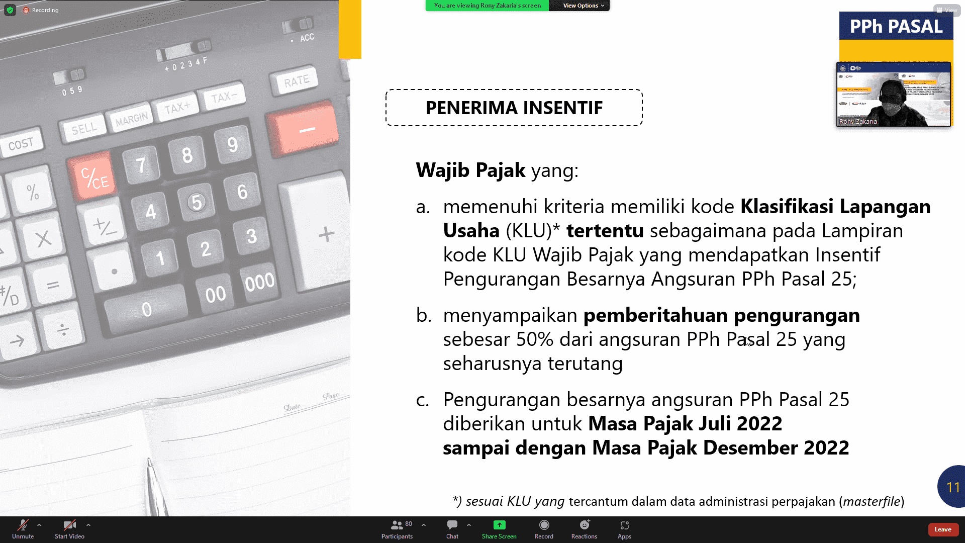 Fungsional Penyuluh Pajak Kantor Pelayanan Pajak Penanaman Modal Asing Empat (KPP PMA Empat) kembali mengadakan Kelas Pajak secara daring yang kali ini membahas tentang Insentif Pajak Untuk Wajib Pajak terdampak Pandemi Covid-19, Pemutakhiran Mandiri NPWP Bagi Wajib Pajak Orang Pribadi, Wajib Pajak Badan, dan Wajib Pajak Instansi Pemerintah, serta tentang Faktur Pajak di Jakarta (Selasa, 23/8). Kelas pajak ini diselenggarakan pada 23 dan 25 Agustus 2022.