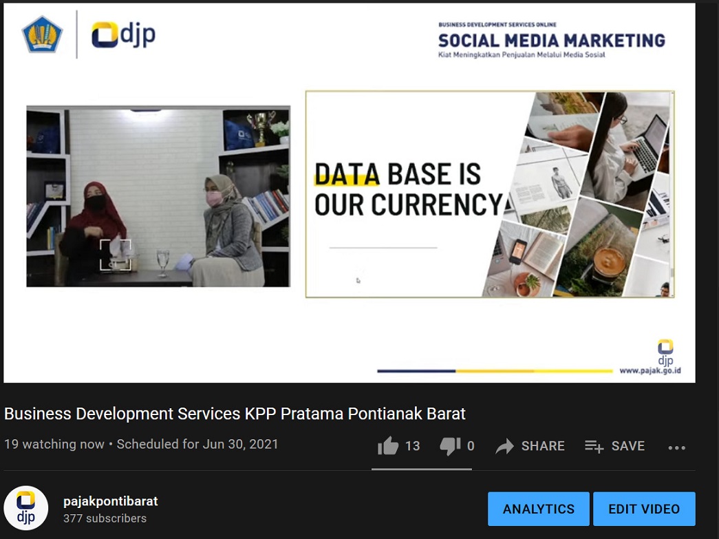 Kantor Pelayanan Pajak (KPP) Pratama Pontianak Barat mengadakan Business Development Services (BDS) tentang Social Media Marketing secara daring, di ruang multimedia KPP Pratama Pontianak Barat, Pontianak (Rabu, 30/6).