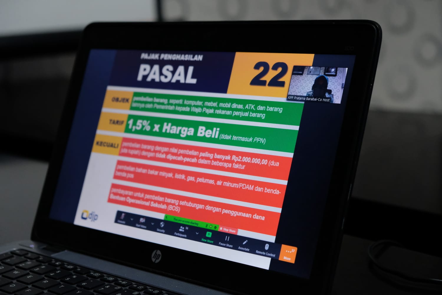 Kantor Pelayanan Pajak (KPP) Pratama Barabai mengadakan sosialisasi perpajakan Instansi Pemerintah yang dilaksanakan secara daring melalui aplikasi Zoom Meeting di Hulu Sungai Tengah, Provinsi Kalimantan Selatan (Rabu, 20/5). Kegiatan sosialisi perpajakan Instansi Pemerintah ini dipandu oleh Tim Penyuluh KPP Pratama Barabai.