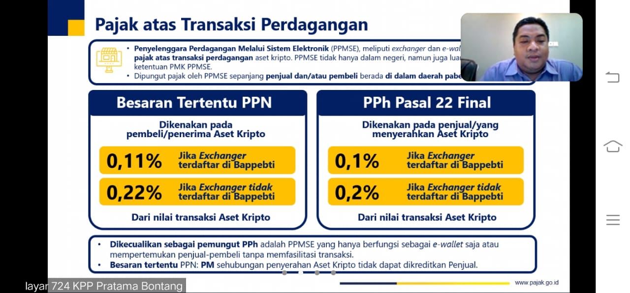 Kantor Pelayanan Pajak (KPP) Pratama Bontang kembali mengadakan kelas pajak secara online menggunakan aplikasi Zoom Meeting di Ruang Rapat KPP Pratama Bontang, Kota Bontang (Kamis, 10/11). Kali ini kelas pajak membahas tentang Peraturan Menteri Keuangan (PMK) Nomor 68/PMK.03/2022 tentang Pajak Pertambahan Nilai dan Pajak Penghasilan atas Transaksi Perdagangan Aset Kripto .