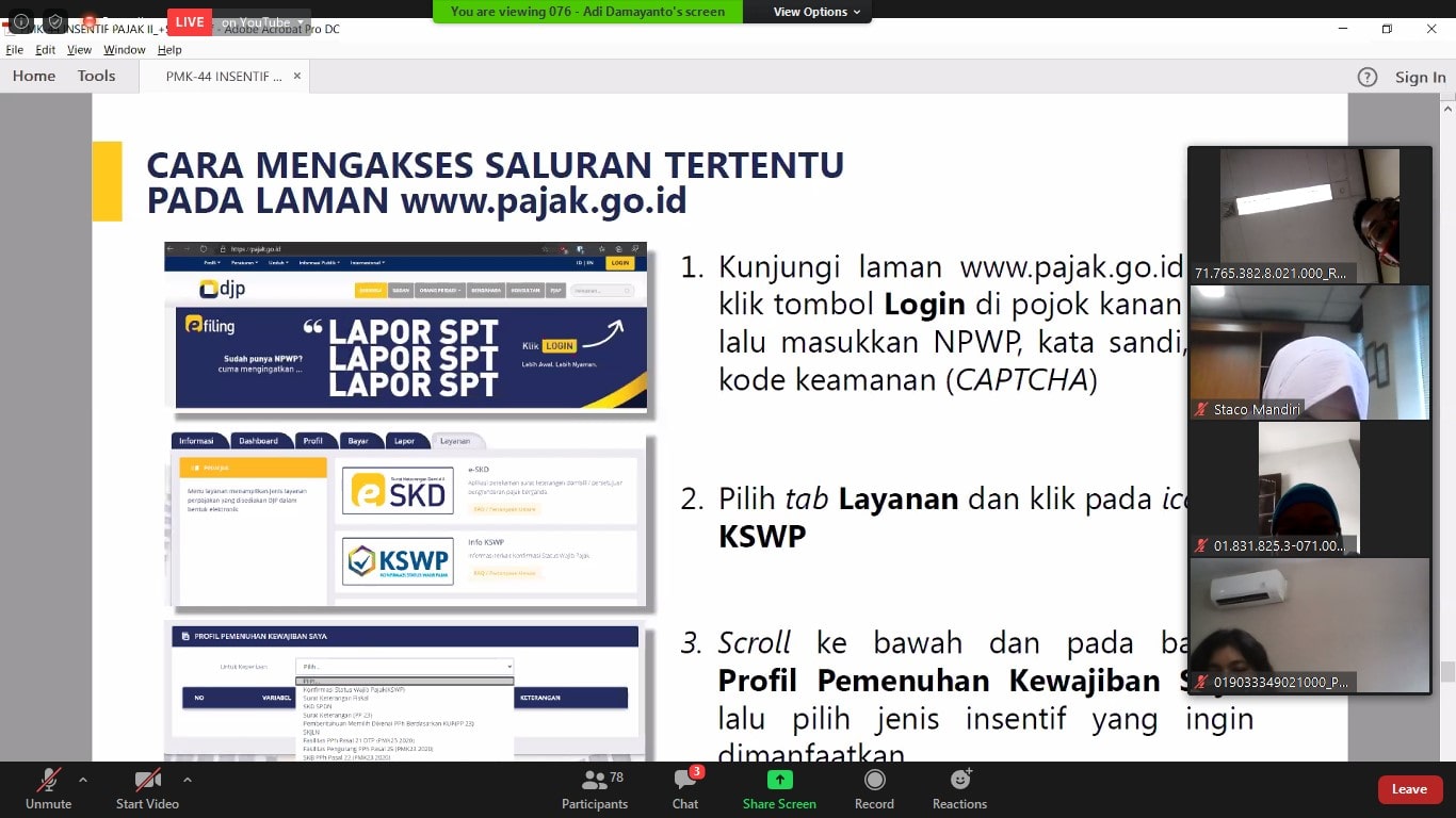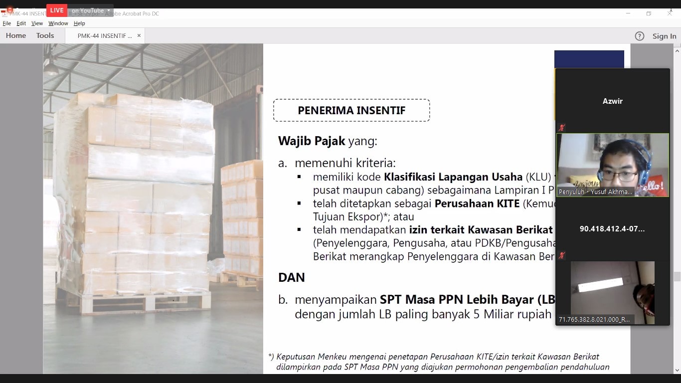 KPP Pratama Jakarta Menteng Satu, KPP Pratama Jakarta Menteng Dua, dan KPP Pratama Jakarta Menteng Tiga secara bersama-sama mengadakan Sosialisasi Insentif Pajak melalui Kelas Pajak Online (Kamis, 18/5). Kegiatan yang diikuti oleh beberapa wajib pajak tersebut membahas Peraturan Menteri Keuangan Nomor : PMK-44/PMK.03/2020 yang mengatur Insentif Pajak Jilid II Sebagai Dampak Covid-19.