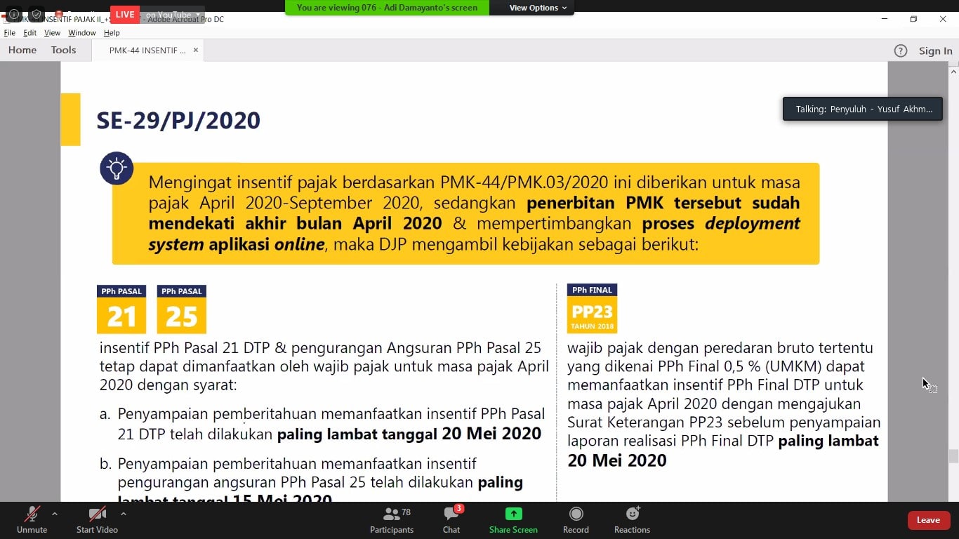 Sosialisasi ini disampaikan oleh Yusuf Akhmadi dan Imanuddin Zauki yang merupakan anggota Tim Penyuluhan Kanwil DJP Jakarta Pusat dan dipandu oleh Rahmawati Zahroh. Sosialisasi ini disampaikan kepada wajib pajak dengan tujuan agar pemberian Insentif Pajak dapat membantu wajib pajak dalam mempertahankan keberlangsungan usahanya yang terdampak pandemi Covid-19. Kegiatan ini berlangsung dengan baik dan lancar dan diakhiri dengan diskusi dan tanya jawab.