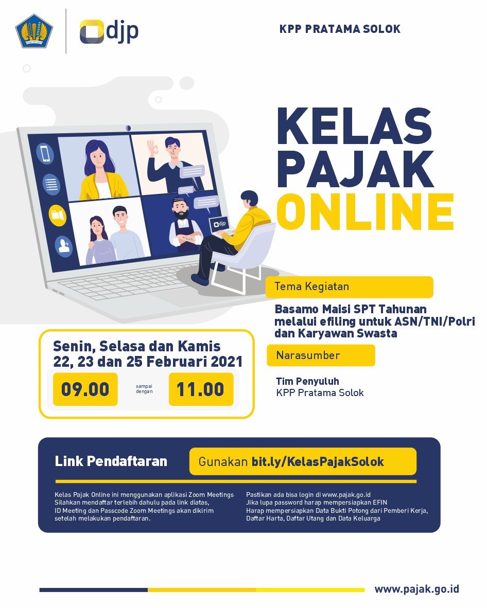 Kantor Pelayanan Pajak (KPP) Pratama Solok mengadakan kelas pajak secara daring dengan tema pelaporan SPT Tahunan PPh Orang Pribadi dengan memanfaatkan aplikasi Zoom Meeting di Kota Solok (Kamis, 25/2). Kelas pajak ini diselenggarakan sejak Senin, 23 Februari 2021.