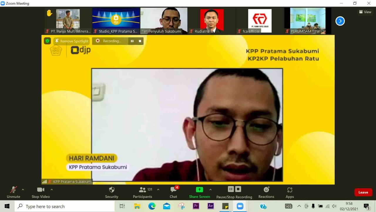 Kantor Pelayanan Pajak (KPP) Pratama Sukabumi kembali menyelenggarakan Kelas Pajak dengan topik Sosialisasi Undang-Undang Harmonisasi Peraturan Perpajakan (UU HPP) kepada lebih dari 100 wajib pajak secara daring melalui media Zoom Meeting di Kota Sukabumi (Kamis, 2/12).