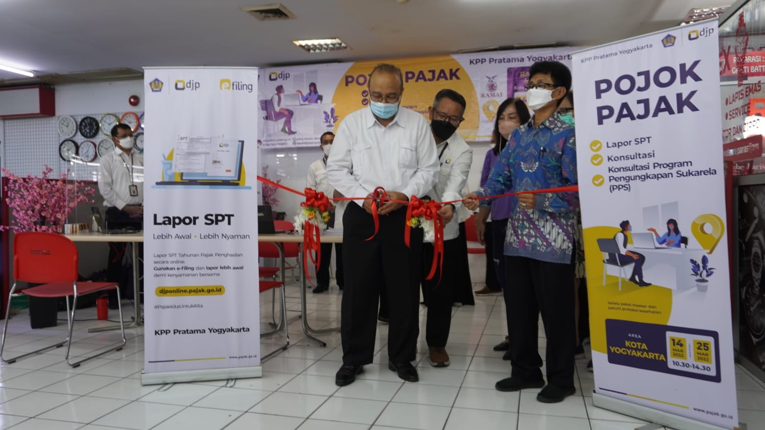 Kepala Kantor Wilayah Direktorat Jenderal Pajak Daerah Istimewa Yogyakarta (Kanwil DJP DIY) Yoyok Satiotomo bersama Kepala Kantor Pelayanan Pajak (KPP) Pratama Yogyakarta Andi Setiawan meresmikan kegiatan pojok pajak yang diselenggarakan oleh KPP Pratama Yogyakarta di Mal Ramai Yogyakarta (Senin, 14/3). Pembukaan pojok pajak ini juga disaksikan oleh pemilik Mal Ramai Yogyakarta.