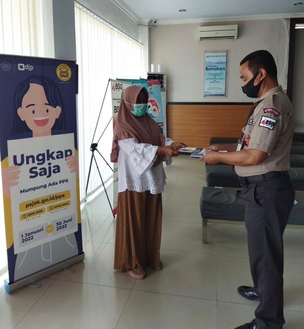 Kantor Pelayanan, Penyuluhan, dan Konsultasi Perpajakan (KP2KP) Tilamuta melakukan kunjungan ke Bank Pembangunan Daerah Sulawesi Utara Gorontalo (BSG) Tilamuta dengan tujuan untuk menyampaikan informasi terkait Program Pengungkapan Sukarela (PPS) kepada nasabah prioritas bank yang terdaftar di Kantor Bank BSG Tilamuta, kabupaten Boalemo, Gorontalo (Senin, 6/6).