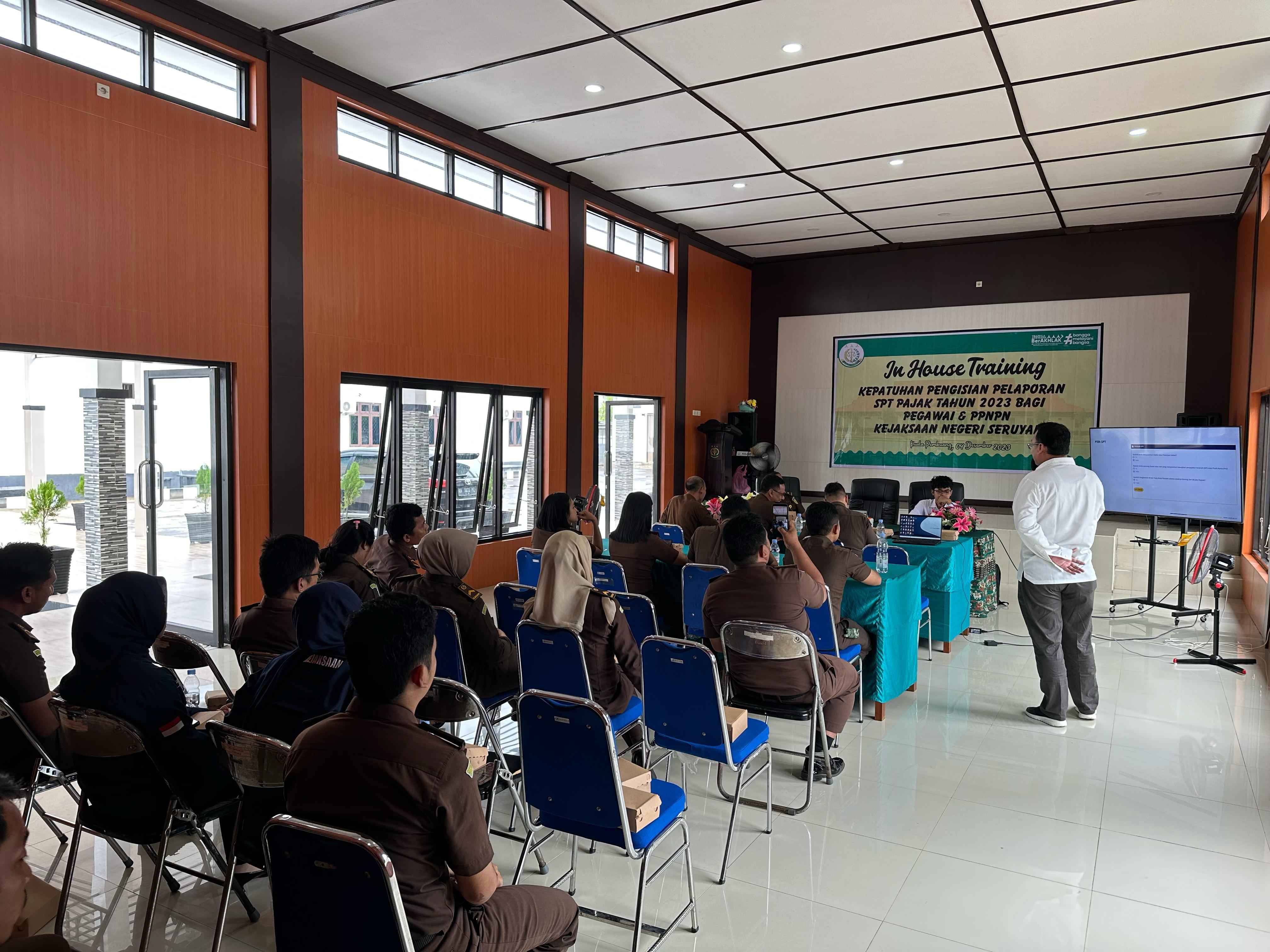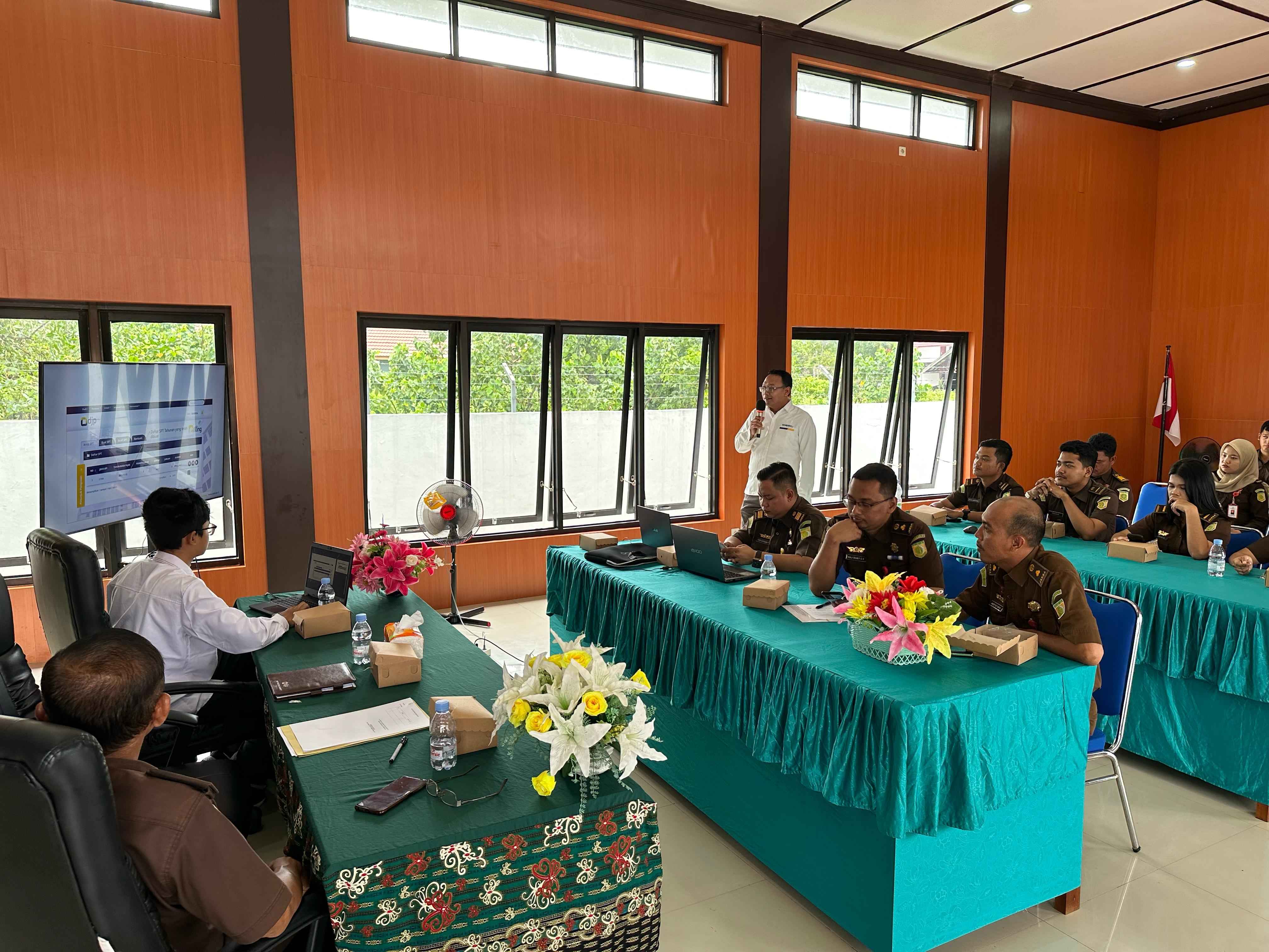 Kantor Pelayanan, Penyuluhan, dan Konsultasi Perpajakan (KP2KP) Kuala Pembuang mengadakan kegiatan dialog dan edukasi pelaporan Surat Pemberitahuan (SPT) Tahunan dan pemadanan Nomor Induk Kependudukan (NIK) menjadi Nomor Pokok Wajib Pajak (NPWP) kepada para pegawai Kejaksaan Negeri Seruyan yang berlangsung di Aula Kantor Kejaksaan Negeri Kabupaten Seruyan (Senin, 4/12).