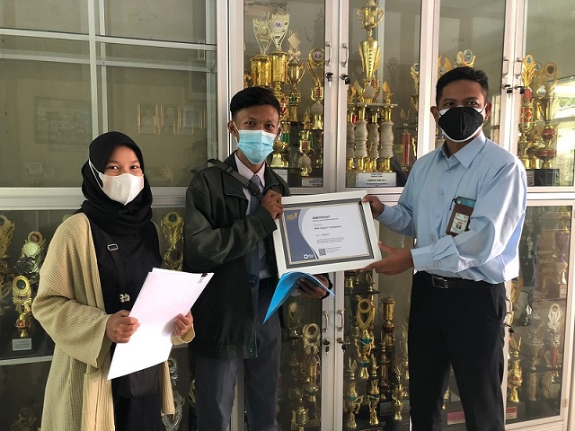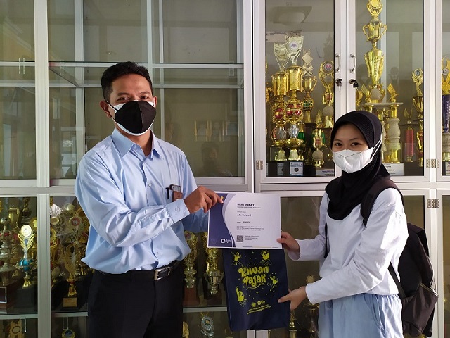 KP2KP Majalengka kunjungi SMK Negeri 1 Kadipaten dalam rangka penyerahan sertifikat dan cinderamata kepada sekolah serta siswa peserta Pajak Bertutur 2021 oleh Kepala KP2KP Eko Budiriyanto (Rabu, 1/9).