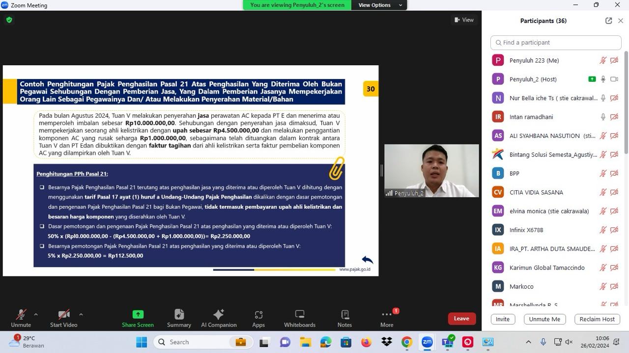 Tim Penyuluh Pajak Kantor Pelayanan Pajak (KPP) Pratama Tanjung Balai Karimun mengadakan kelas pajak tentang peraturan baru Pajak Penghasilan (PPh) Pasal 21 secara daring untuk wajib pajak di wilayah Kabupaten Karimun, Kepulauan Riau (Senin, 26/2). Kelas Pajak diikuti kurang lebih 50 peserta dari bendahara instansi pemerintah dan beberapa perwakilan pemberi kerja yang terdaftar di KPP Pratama Tanjung Balai Karimun yang bertujuan mensosialisasikan tata cara penghitungan dalam pemotongan PPh Pasal 21 dengan Tarif Efektif Rata-Rata (TER) yang sudah berlaku untuk tahun 2024.