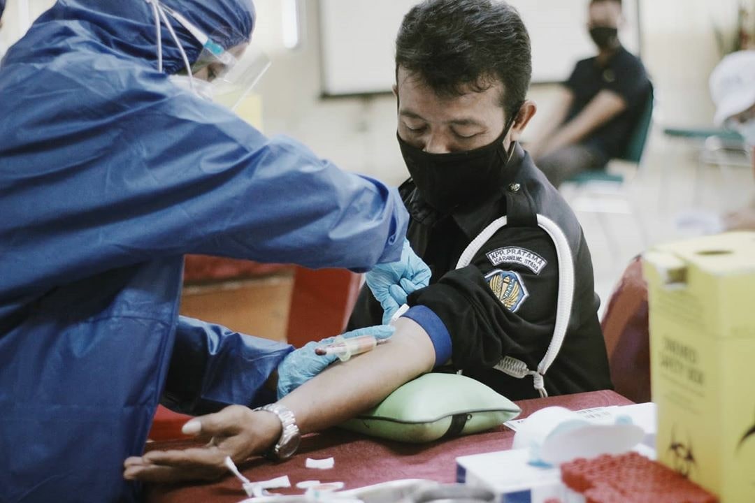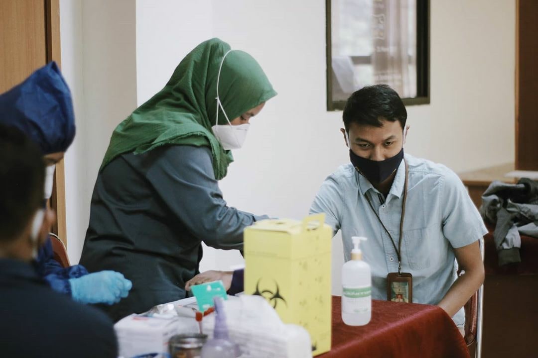Bekerja sama dengan Parahita Diagnostic Center Bekasi, setiap pegawai wajib mengisi data diri dan menjawab beberapa kuesioner, kemudian mengisi daftar hadir dan antre di kursi yang telah disediakan. Setelahnya, petugas akan mengecek suhu tubuh setiap pegawai dan dilakukan pengecekan saturasi oksigen menggunakan pulse oxymeter hingga kemudian dilakukan pengambilan darah. Terdapat enam petugas yang mengenakan Alat Pelindung Diri (APD) lengkap dari Parahita Diagnostic Center Bekasi.