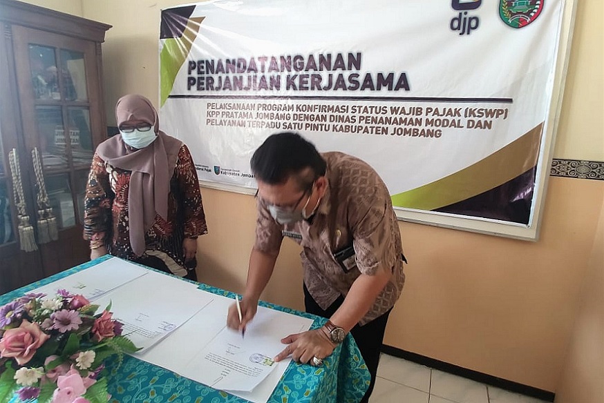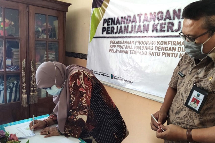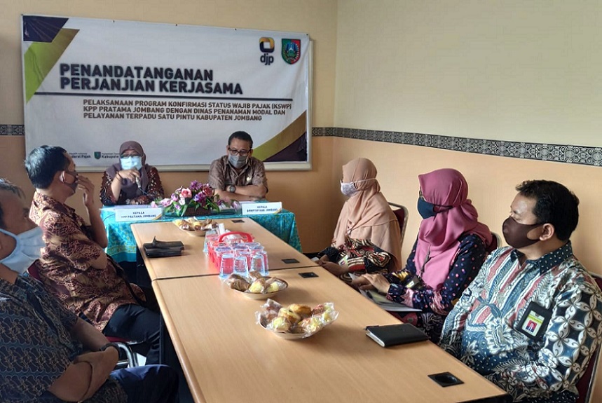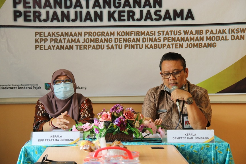 KPP Pratama Jombang bersama dengan Dinas Penanaman Modal dan Pelayanan Terpadu Satu Pintu (DPMPTSP) Kab. Jombang melaksanakan penandatanganan perjanjian kerja sama (PKS) di ruang rapat DPMPTSP Kab. Jombang di Jombang (Selasa, 23/6).