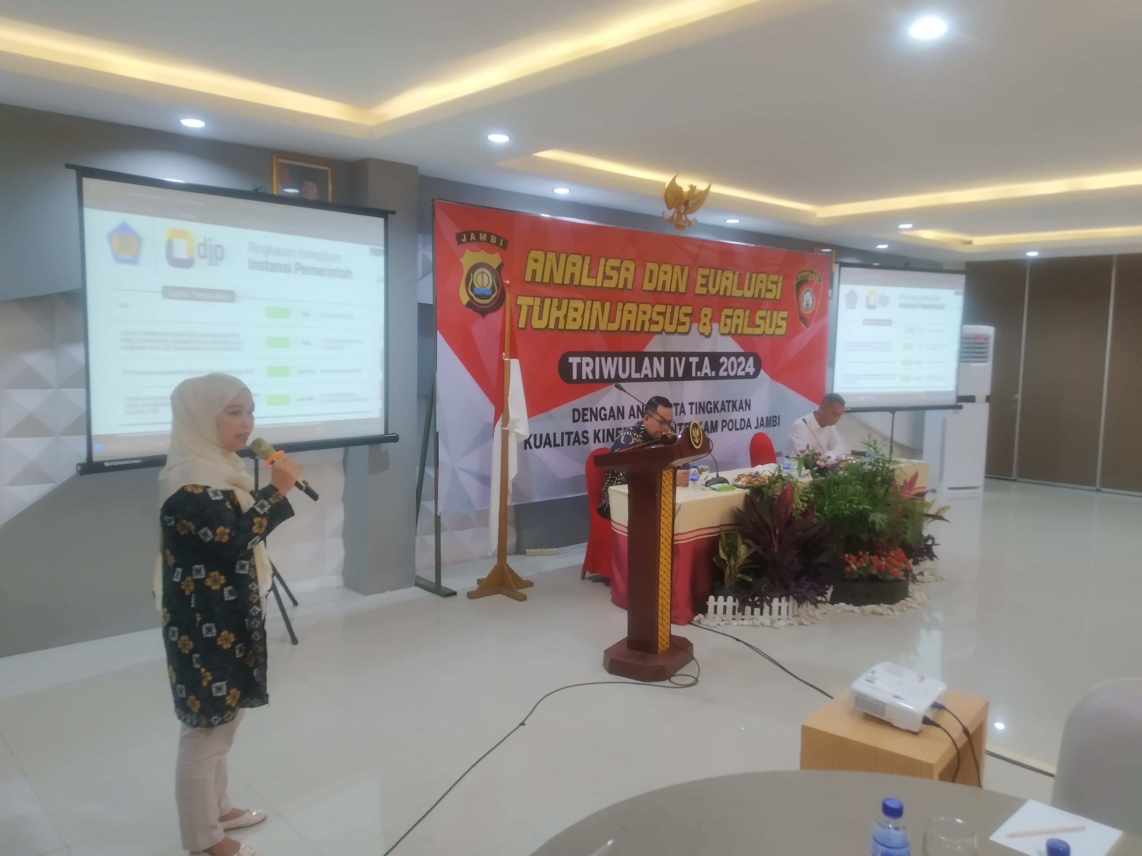Kantor Pelayanan Pajak (KPP) Pratama Jambi Telanaipura hadir sebagai narasumber dalam kegiatan Analisa dan Evaluasi Pelaksanaan Pembentukan dan Pembinaan Jaringan Khusus (Tukbinjarsus) dan Penggalangan Khusus (Galsus) Triwulan IV Tahun Anggaran 2024 dengan tema “Dengan Anev, Kita Tingkatkan Kualitas Kinerja Ditintelkam Polda Jambi”.