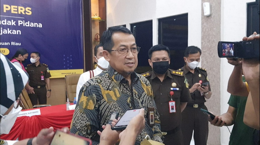 Kepala Kantor Wilayah (Kanwil) DJP Kepulauan Riau (Kepri) Cucu Supriatna mengadakan konferensi pers di aula Kantor Pelayanan Pajak (KPP) Pratama Bintan saat menyerahkan wajib pajak KPP Bintan yang menjadi tersangka tindak pidana perpajakan kepada Kejaksaan Tinggi (Kejati) Kepri (Selasa, 9/8).