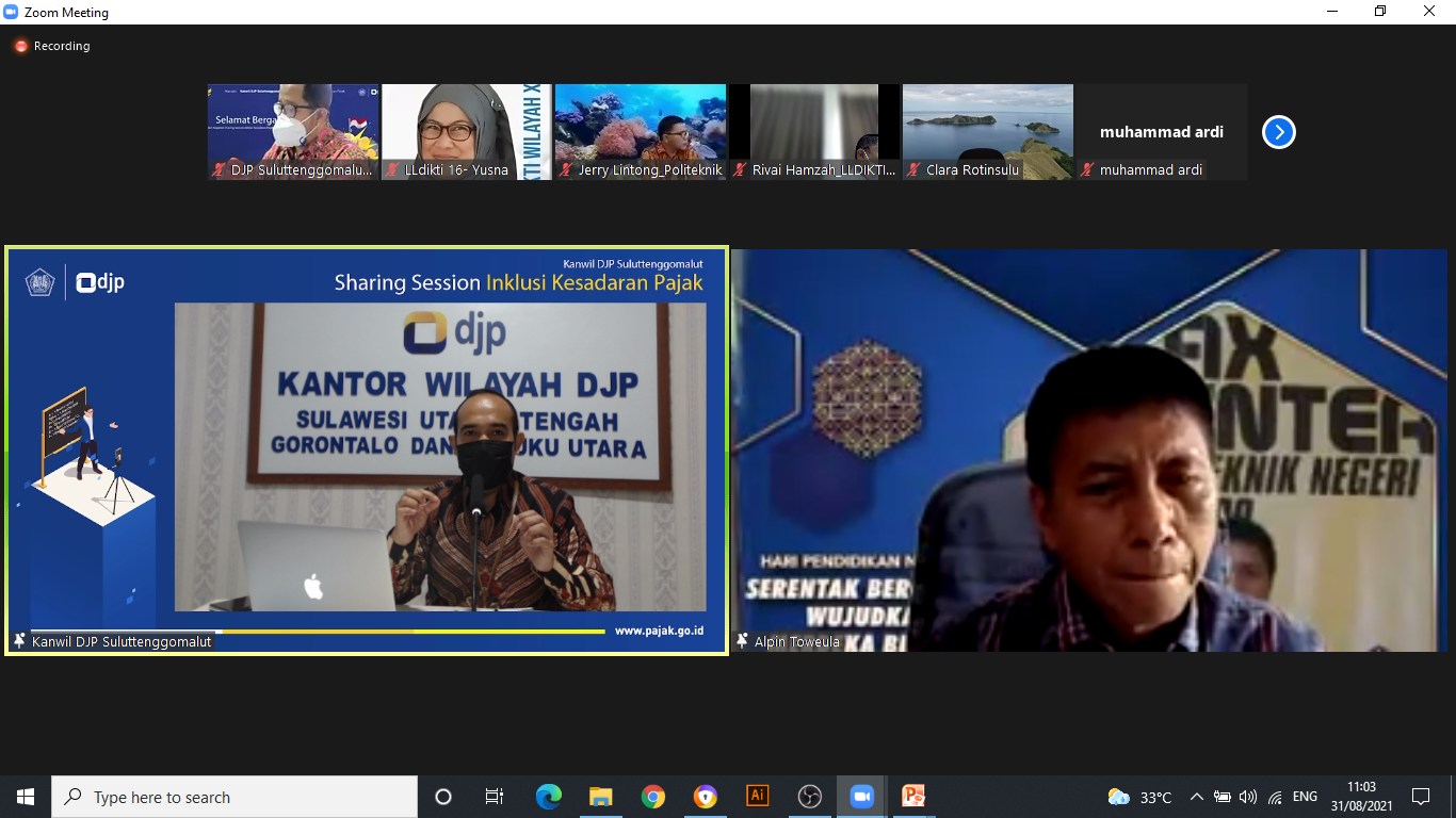 Kantor Wilayah Direktorat Jenderal Pajak Sulawesi Utara, Tengah, Gorontalo, dan Maluku Utara (Kanwil DJP Suluttenggomalut) mengadakan koordinasi dan sharing session Program Inklusi Kesadaran Pajak secara daring bersama 5 (lima) Perguruan Tinggi di Wilayah Kanwil DJP Suluttenggomalut (Selasa, 31/8).