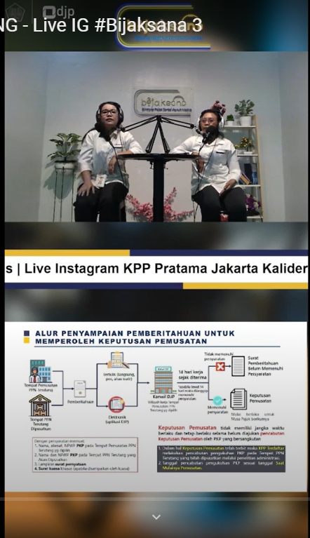 Kantor Pelayanan Pajak (KPP) Pratama Jakarta Kalideres melangsungkan siaran edukasi perpajakan dengan tema “Tempat Pemusatan Pajak Pertambahan Nilai (PPN) Terutang” melalui fitur siaran langsung di media sosial Instagram @pajakkalideres (Senin, 24/6).
