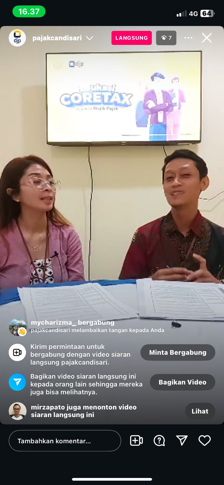Tim Penyuluh Kantor Pelayanan Pajak (KPP) Pratama Semarang Candisari melalui Live Streaming Instagram (IG) @pajakcandisari membahas topik Coretax kepada Kawan Pajak di dunia maya untuk mengenal aplikasi Coretax pukul 16.00 WIB hingga selesai (Jumat, 13/12).