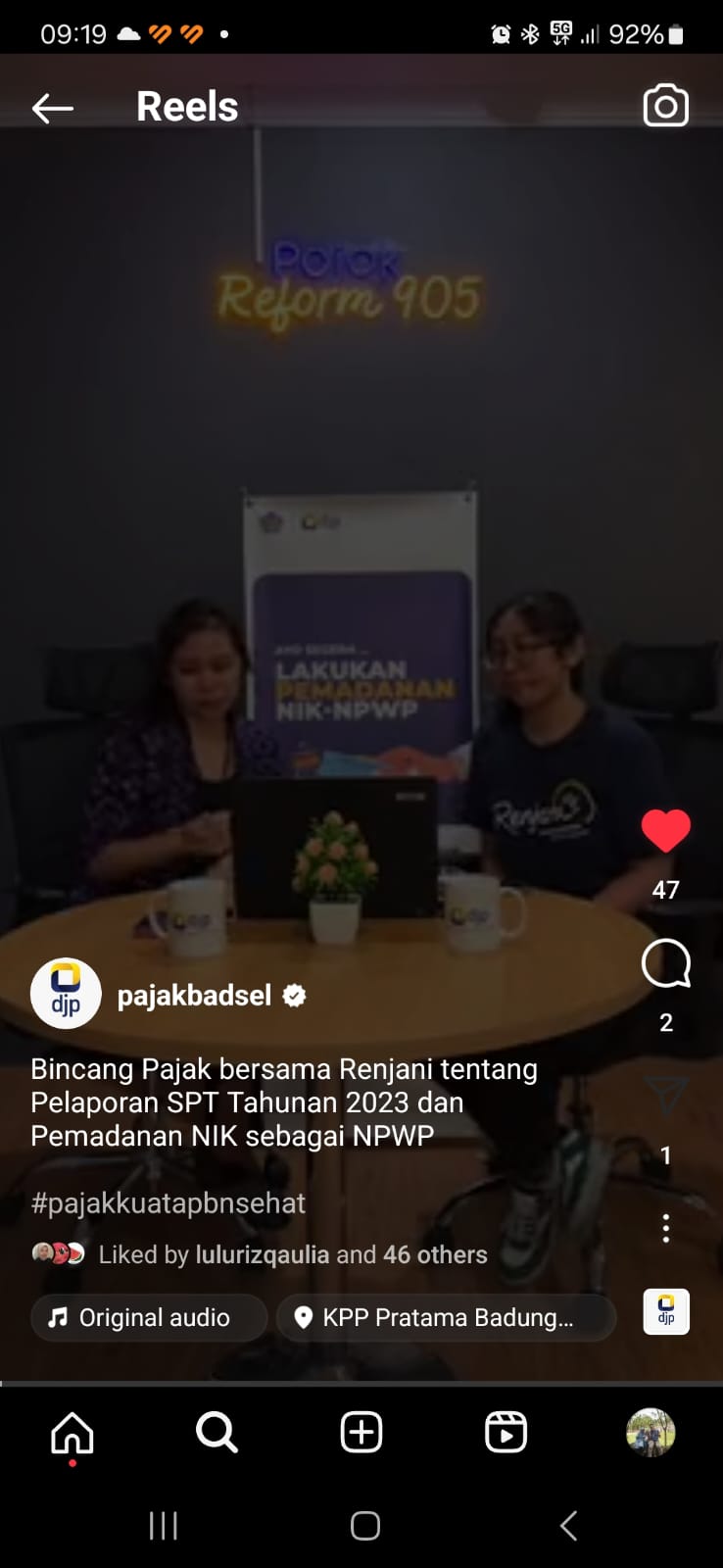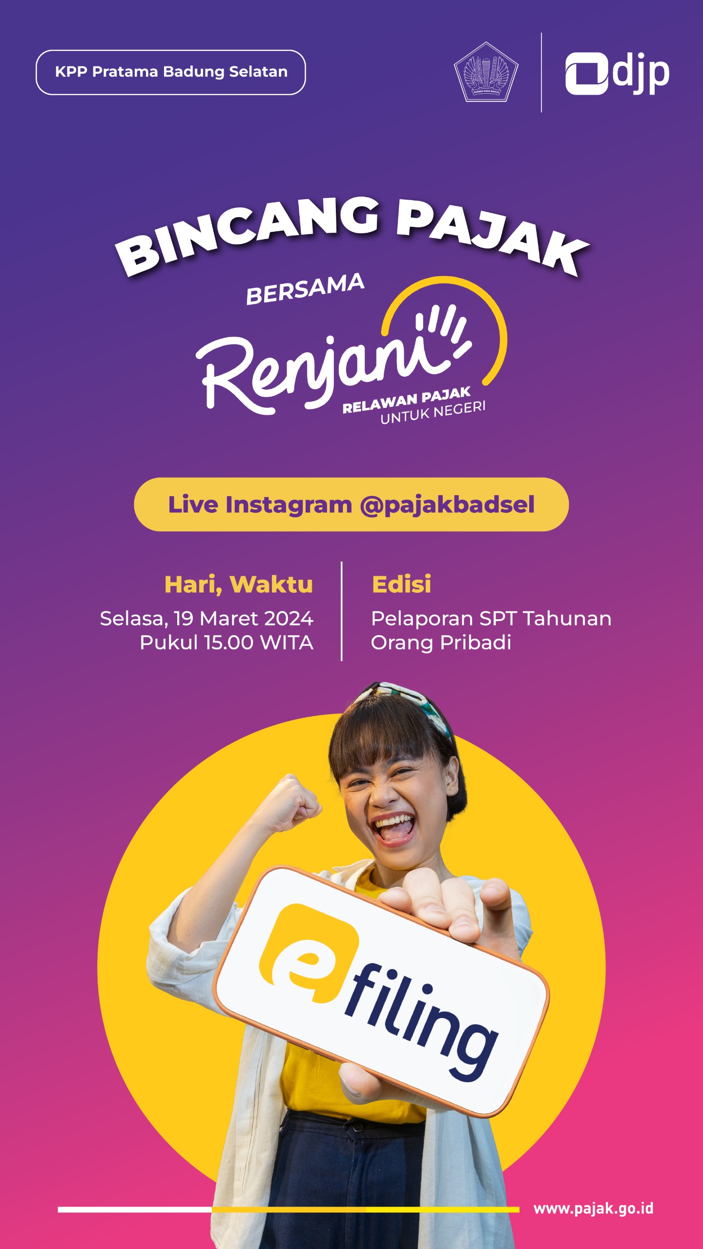 Kantor Pelayanan Pajak (KPP) Pratama Badung Selatan mengadakan edukasi dengan tema Pelaporan SPT Tahunan Orang Pribadi serta Aktivasi EFIN melalui Instagram Live @pajakbadsel di KPP Pratama Badung Selatan, Bali (Selasa, 19/3). Edukasi perpajakan disampaikan oleh Penyuluh Pajak KPP Pratama Badung Selatan Sherley Diana Thandung sebagai pemateri dan Made Nathalia yang merupakan relawan pajak sebagai moderator.
