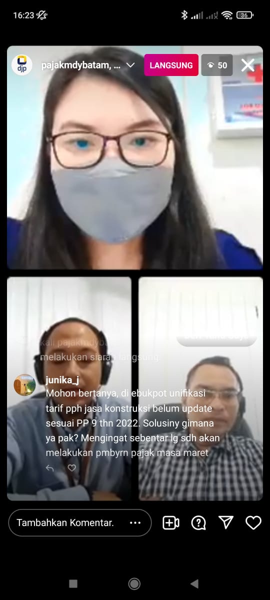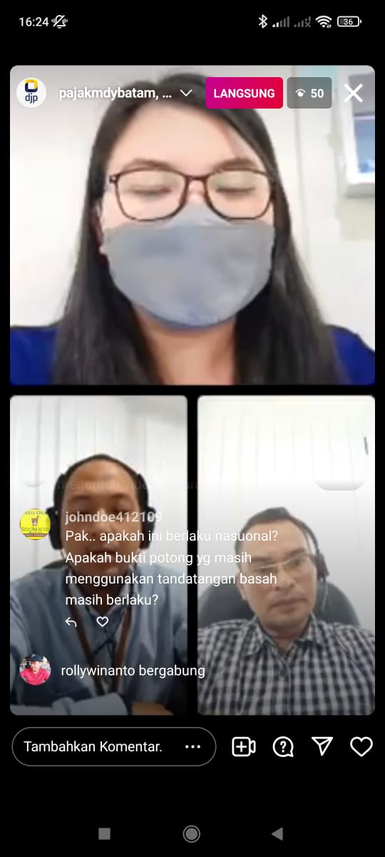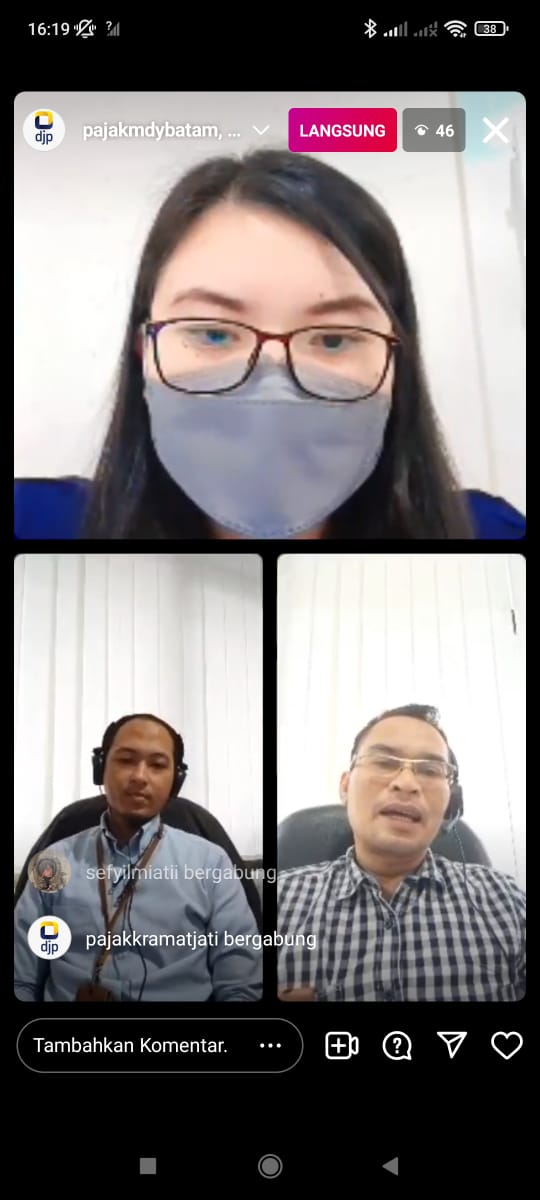Live Instagram dibawakan oleh Fungsional Penyuluh KPP Madya Batam yaitu Juliana sebagai moderator serta Ismail dan Chairul sebagai narasumber. Kegiatan yang diadakan selama 30 menit ini diikuti oleh banyak peserta yang mengajukan pertanyaan saat siaran berlangsung. Untuk selanjutnya, KPP Madya Batam akan terus memberikan informasi-informasi mengenai perpajakan melalui Live Instagram KPP Madya Batam (@pajakmadyabatam).