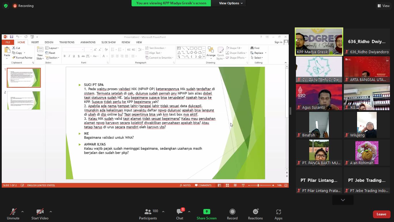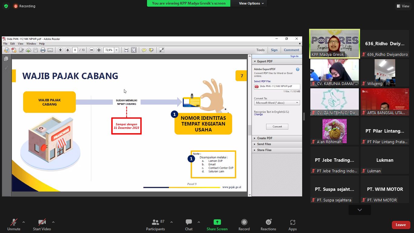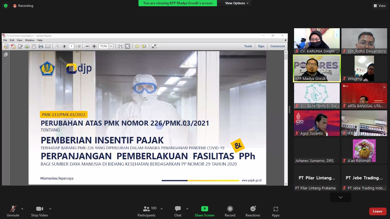 Kantor Pelayanan Pajak (KPP) Madya Gresik mengadakan Kelas Pajak Online: Pemberlakuan 3 Peraturan Menteri Keuangan (PMK) Baru di Gresik (Selasa, 30/8). Kelas pajak dihadiri oleh wajib pajak KPP Madya Gresik yang telah diundang sebelumnya.