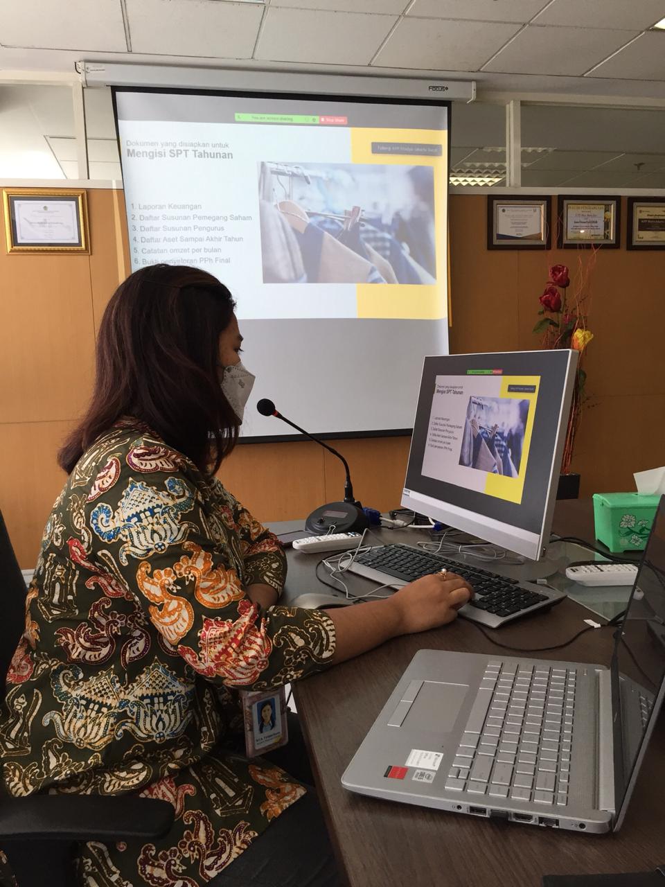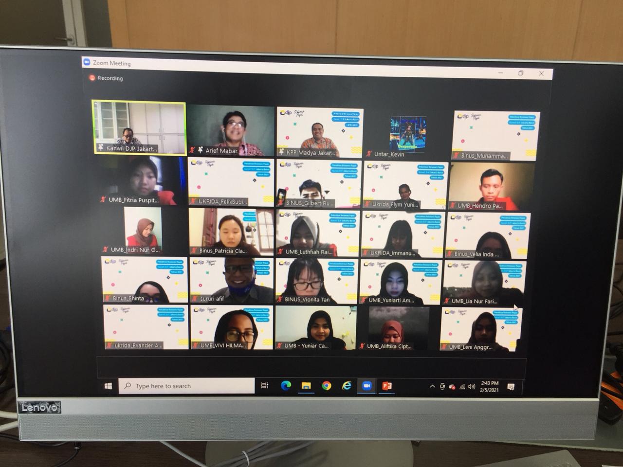 KPP Madya Jakarta Barat menjadi pembicara pelatihan Relawan Pajak secara daring di Jakarta Barat (Jumat, 5/2). Sejumlah 255 mahasiswa dari tujuh tax center peserta Program Relawan Pajak hadir untuk mendapatkan materi Pengisian SPT Tahunan 1771 melalui e-Filling dan e-Form.