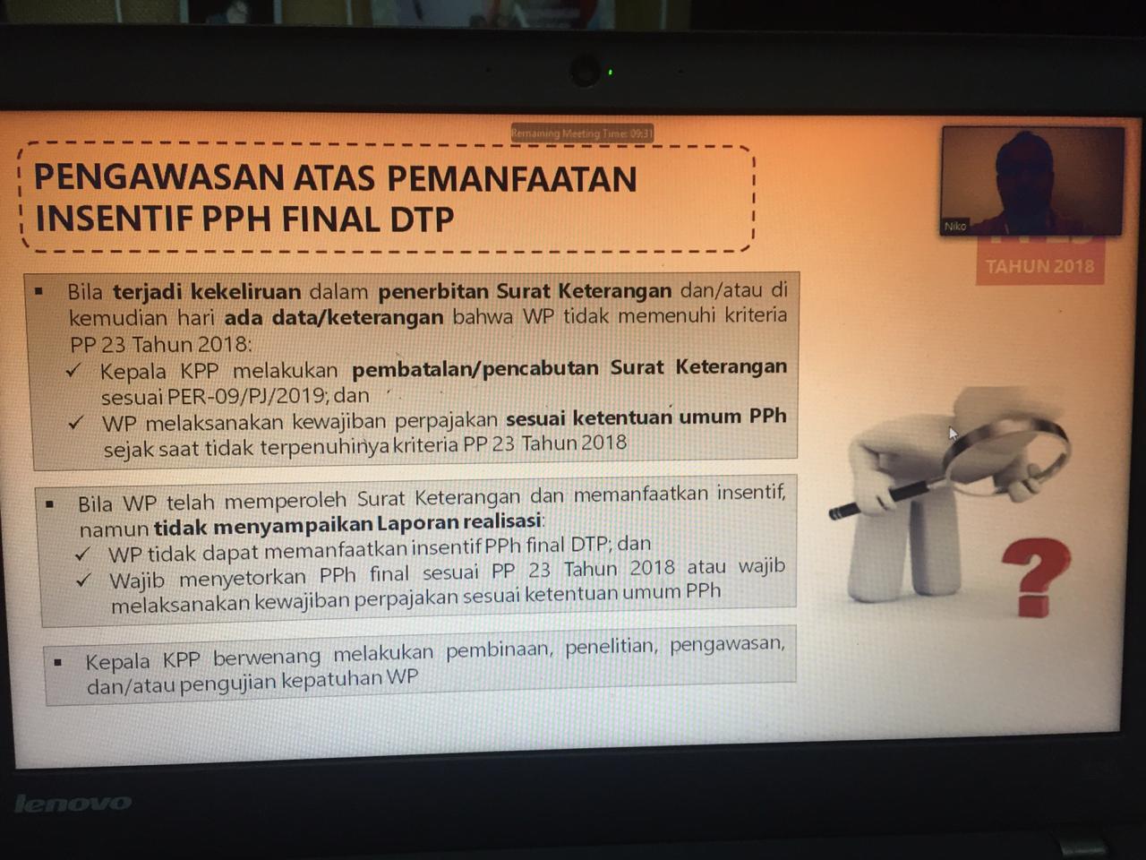 Narasumber kelas pajak kali ini adalah Sunu Harijadi selaku Kepala Seksi Pengawasan dan Konsultasi III dan Thomas Sugiarto selaku Account Representative Seksi Pengawasan dan Konsultasi III KPP Madya Jakarta Barat. Para peserta menyimak materi yang diberikan dan aktif dalam sesi tanya jawab dengan menanyakan kendala-kendala yang dihadapi. Tidak berhenti di Zoom Meeting saja, para peserta dan narasumber juga melanjutkan diskusi melalui WhatsApp.