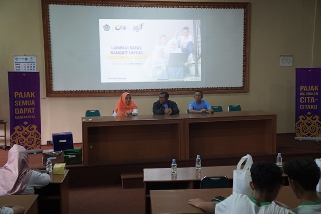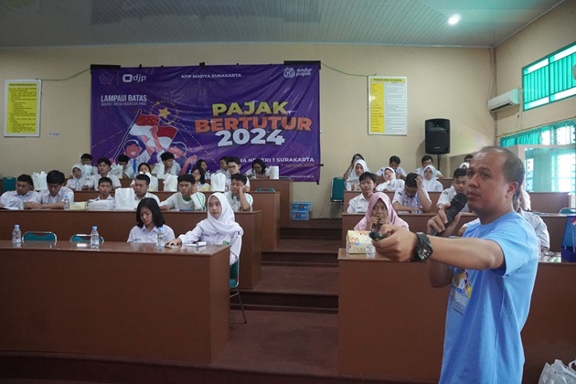 Kantor Pelayanan Pajak (KPP) Madya Surakarta menyambangi SMA Negeri 1 Surakarta untuk melaksanakan kegiatan Pajak Bertutur 2024, Rabu (7/8). Pajak Bertutur dilaksanakan dalam rangka mengampanyekan program inklusi kesadaran pajak dalam pendidikan dan peringatan hari kemerdekaan RI yang ke-79. Kegiatan ini diikuti oleh 44 siswa dan siswi kelas X-XII SMA Negeri 1 Surakarta sebagai peserta dan didampingi oleh 3 orang guru. Pajak Bertutur tahun ini mengusung tema “Lampaui Batas untuk Bangkit Menuju Indonesia Emas.”