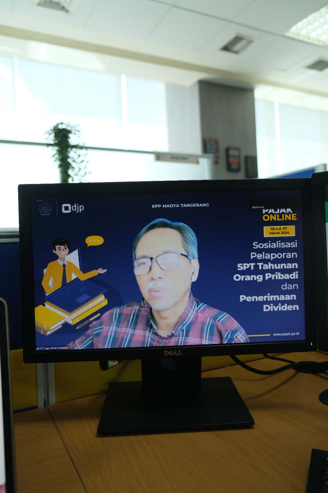 Kantor Pelayanan Pajak (KPP) Madya Tangerang menyelenggarakan kelas pajak secara daring terkait dengan Sosialisasi Pelaporan Penerimaan Dividen pada Surat Pemberitahuan (SPT) Tahunan PPh (Pajak Penghasilan) Orang Pribadi dan Program Pembaruan Sistem Inti Administrasi Perpajakan (PSIAP) Direktorat Jenderal Pajak (DJP) bertempat di Ruang Rapat KPP Madya Tangerang, Jalan Jalur Sutera Barat No.3, RT.003/RW.006, Panunggangan Timur, Pinang, Kota Tangerang, Banten (Kamis, 7/3).